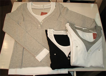 お休みしていた間に、ずいぶんたくさん納品があったので、早速商品の写真です。右写真、めちゃめちゃ売れてます。重ね着風なカットソー。 タンクトップにヘンリーネックぽいTシャツを重ねてあるように作ってあるもの。ポケットがリベットで留めてある。 VERY3月号にも載っていたようです。 ●ドゥミルアンズ重ね着風カットソー ¥8900(税込み¥9345) 今だったら、コートの中に。5月頃にはコレ1枚でOK。 頼れる1枚。 |