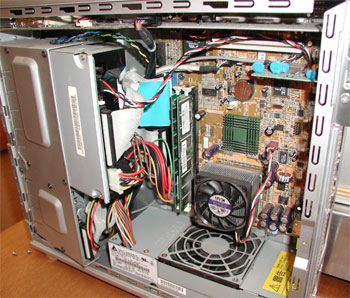 さて、右写真の機械は何でしょう?このホームページ書いているコンピュータの中身。 こんな無骨な機械から、いろいろな物が出てくるんだから不っ思議ですよねぇ。 ・・・・と、そんな話のために中身を開けたのではなく、メモリーの増設をしました。 256メガ→768メガに。 ちょうど写真中央の、マザーボードに垂直に2枚突き刺さっている板チョコみたいなのがメモリー。 左が新しく挿入した512MBのメモリーです。 メモリーって、けっこう簡単に増設できるんですよ! 結果は、、、処理速度がめちゃめちゃ早くなった! これで、ストレスなく、このページも書けるってぇわけです! いくらパソコン早くなっても、ネタ不足のストレスからは開放されないんですけどね(笑) |
