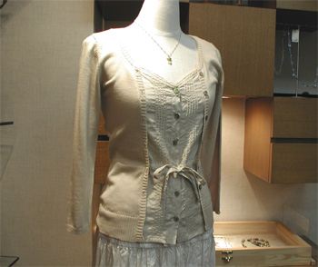 ![]() 今日はエイプリルフール。 皆様、どのような嘘をおつきになられましたでしょうか? さて。右写真、カーディガンを羽織っているようにも見えますが、実は一枚で着る、布帛がくっついているニット。 ●ベアトリス 重ね着風ニット *Sold out ¥16000(税込み¥16800) 綿100% 別布 キュプラ63% 綿37% 一枚で、重ね着に見えるアイティムは、あれこれ考えずに済む楽チンアイティム。オススメです。 |