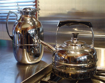 壊れたポットで新しい年を迎えるのもなんだ、、、ということで、ポット、買ってしまいました!いろいろ見て悩む暇もなく、結局ドイツのアルフィ社の、アルフィ・ジュエルってやつにした。ネット通販でお買上げ。 アルフィ社は1914年創業。ジュエルは1918年に登場したから、90年近く定番として作ってる。ス、、スゴイ、、 胴体は黄銅クロムメッキ、フタと口金は亜鉛合金とクロムメッキ。保温能力も、今までのよりもいいみたい。まさに機能美。 口もプラスチックじゃないからコレなら長持ちしそう・・・ ちなみに、右のケトルが、イギリス、シンプレックス社のクイックガスケトル。 この美しいポットとヤカン見てニヤニヤしているボクって、少し変なのかなぁ、、 |