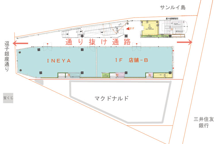 一昨日、「ビル内通路に、、、」と書きましたが、、ビル内通路って何?と突っ込みを入れられそうなので一応・・・右の図面の通り、銀座通り側から、銀行横の細い路地にビル内を通って抜けられるように計画しています。 お店のファサードが広くなるのと、商業ビルっぽい雰囲気を作りやすくするために。 この通り抜け通路の途中に、地下への階段も、エレベーターもあるので、1F以外のテナントさんへのアクセスもしやすいと思う。 ちなみに、夜(最終テナントの営業が終了後)は、安全上のため管理扉を閉めるようになります。 というわけで、テナント募集中!特に、地下1Fと、3F・・・ エレベーターの速度も、けっこう速いのを入れるので、3Fでもあっという間ですよ! お問い合わせは、アースウィンド(03-6226-4666)まで。 |