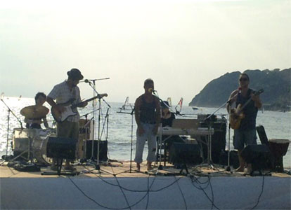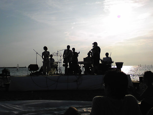 昨日の予告通り、今日は第一回逗子海岸国際芸術祭。写真は、ウミカメの出番の次のバンドの写真。 いや〜、、、、海をバックにステージが見えて、贅沢な時間だったと思います。 少し静かな曲は、波の音が聞バックにこえるんですから。 観客も150人くらいはいて、みんな、お酒を飲みながらそれぞれ音楽を楽しんでいました 我がバンド、ウミカメは・・・ 演奏はいつもどおり良かったと思いますが、僕がステージから降りるときに踏み台が倒れ、左腕を殴打。倒れた踏み台がベースのAのスネを直撃。。。。という忘れられないLIVEになりました。 というわけで、左腕は痛いので、どうかご来店の際には触らないようにお願い致します。 |