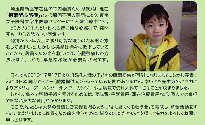 | え〜、、今日は少し真面目なお話を。(いつも真面目ですけど) 昨日、妻宛てに学生時代の友人から「よしきくんを救う会にご協力いただきたい」という趣旨のメールが届きました。 よしきくんとは、竹内義貴くん、埼玉県新座市在住の9歳で、拘束型心筋症という50万人に一人と言われるほどの希で、難しい心臓病と戦っています。(妻の友人のお子さんと、同じ学校に通っている) 治療を続けてはいますが、心臓の機能は徐々に低下しており、命を救うには心臓移植しか方法がないらしい。 海外での臓器移植は莫大な費用がかかる、、、 その金額は・・・なんと6600万円!! (内訳) 医療費 5200万円 渡航費 700万円 滞在費 500万円 事務所経費 200万円 9月13日現在の募金総額はまだ1400万円、とのことです。 50万人に1人ということは、50万人の親御さんが、自分の子供を思う気持ちで、1000円ずつ募金したら、50万人×1000円で、、、、5億・・・ は多いか。 50万人×125円で、6250万円! 日本でも子供の臓器提供が認められるようになったようですが、義貴くんには、ドナーを待っている時間がないそうです。 大勢の人の、少しの善意で子供の命が助かるのならば・・・ 詳しくは、よしきくんを救う会のホームページをご覧ください。 楽天ショップの、「ゴルフのロストボール屋さん」でも、募金を受け付けているようです。 こちらは楽天ポイントでも募金を受け付けている模様。 期限切れ間近なポイントをお持ちの方は是非ご協力を。 ![]() |
