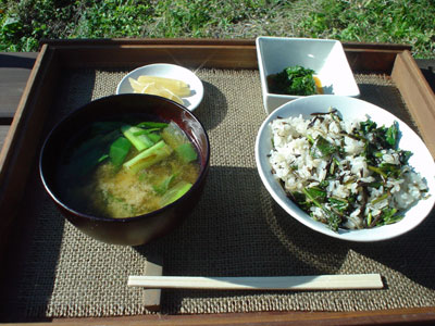 注文してから待っているうちに続々とお客さんがきて、帰る頃にはけっこうな人数になっていました。頼んだのは右写真、空芯菜とじゃことひじきのかて飯セット。 味噌汁は、島根県産の味噌(名前は忘れた)に、具は里芋と焼きネギ。 それに、大根の古漬けと、ニンジンの葉のお浸しがついていた。 シンプルで素材の味がとても美味しかったな〜、、、 ついでに、箸置きはこの畑の土で作ったものなんですって。 太陽の下で、採れたての野菜を、野菜が育った畑で食べる。なんか懐かしい感じの贅沢さが味わえました。 |