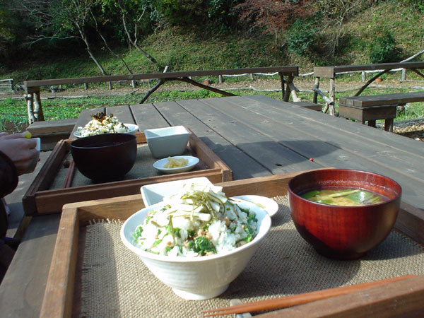 昨日は定休日。家族そろって、またまたSYOKU−YABO農園に行ってしまいました。お昼ゴハンを食べに。 息子(1歳9カ月)は、そこそこ量を食べるけれど、さすがに一人前は無理そうだな、と思っていたら、「かてめし、大盛りにしたら子供さんと食べられますよ」と厨房のP君。その大盛り具合が左写真です。 妻はサツマイモの葉とほぐしたぶりの醤油かてめし ※しその実入り 僕は大根葉と豚ひき肉の魚醤かてめし ※鯖のナンプラー使用 デザートには甘味とお茶。 万次郎かぼちゃの茶巾、さつま芋の茶巾、大豆茶、ふくぎ茶を頼む。 美味しいですね。息子(1歳9カ月)も「オイチー」と申しておりました。里芋(味噌汁の具)も、「インモ!」とおかわりをしていた。 食後は、あちらこちら歩きまわり、置いてあった漬物樽の蓋をあけたり、万次郎かぼちゃを撫でたり、階段を上ったり、山を見上げて「タカイ」と言ったり、楽しそうでした。 今度は、野菜の収穫体験をさせてもらいに行こうと思います。 |