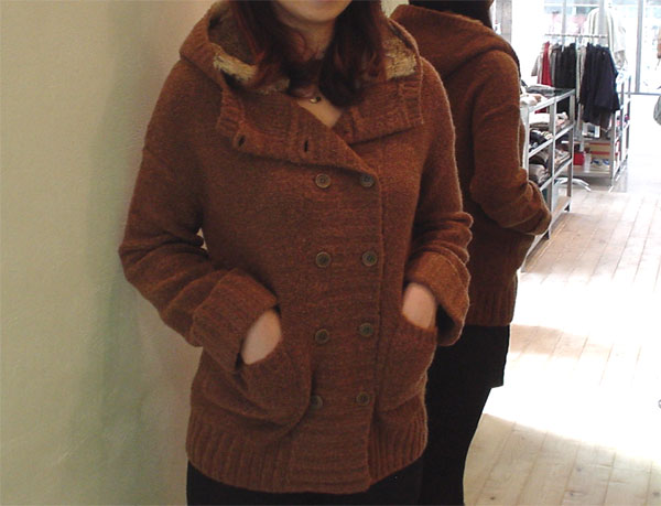朝は寒いのに、日中は暑い・・・ なんていう日が数日続いているお陰か、店頭ではコートが売れてきました。 が、一番人気はコートより少し手前のニットの羽織物。 朝晩の寒さ対策なら、ちょっとフワッとした暖かいニットがオススメです。 ポンチョ、ケープタイプも、変形カーディガンタイプも人気。 写真は一見普通のダブルのニットカーディガンですが、フードがついていて、フードにはラビットのファーもあしらってあります。(ファーは取り外しできます) ピュリフィエのもので、お値段は \30450(税込) 他にチャコールグレーもあり。 けっこうオススメ。店頭でどうぞ。 |