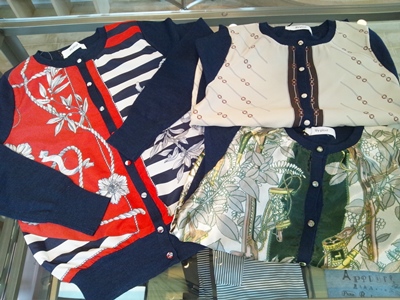 さて。写真は少し変わったデザインのカーディガン。 普通の、クルーネックリブニットのカーディガンの袖と裾に、少しハリがあるタフタ生地が付いています。 シンプルなTシャツやパンツも、コレを一枚羽織るだけで今年っぽく様になりそうな優れ物。 気になるお値段は、¥16800(税込) 詳しくはコチラのページをどうぞ。 |