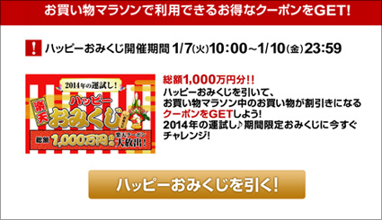さて。いよいよ本日夜8時から、WEBショップでのセールが始まります。そして、明日、11日から13日は、楽天のお買いものマラソン。その時に使えるクーポンがあたる「ハッピーおみくじ」が明日まで引けますので、引いてみてはいかがでしょう・・・?(Facebookユーザー限定) ちなみに、ボクはハズレでした。 「当たりなんてほとんどないんじゃないの?」とブツブツ言っていると、スタッフHさんが、「私は100円あたりましたけど」と。 うーむ。初詣のおみくじも末吉でしたし、今年の出だしはゆるりとした感じなのでしょうか・・・? 皆さまも運だめしに是非・・・ コチラからどうぞ。 |