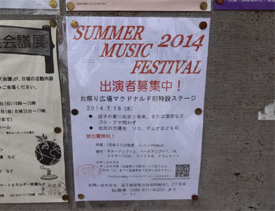 今年も、逗子の夏祭りの、駅前ステージの出演者募集が始まりました!(サマーミュージックフェスティバル2014)「逗子の夏に似合う音楽や演芸」ということで、PA、ミキサー、アンプ類、ドラムセット等も用意されます。(鍵盤楽器はナシ。持込みになります。) 例年、様々なジャンルのバンドが出演しますが、逗子駅前のたくさんの人の前で、腕試しをしたいバンドマンの方! 是非応募をお待ちしております。 昨年出演してくれた、「ほにゃららズ」という女子高生バンド、まだ続けていたら今年も是非・・・ 技術はまだまだだったけど、魅力溢れるバンドでした。 オジサン、オバサンのバンドも歓迎!ソロ、デュオも可!下手でも大丈夫!(ただし、応募多数の場合には審査あります) ビッグバンドやコンボのジャズ大歓迎!!(←個人的な趣味です) 詳しくはコチラをご覧ください。(応募用紙ダウンロードもできます) |