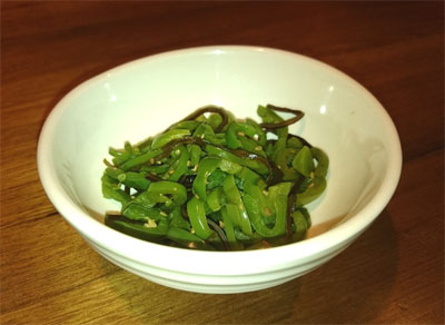 逗子にある自然食品の店、「陰陽洞」さんで教わった、簡単で美味しいピーマン料理を作ってみました。料理、といってよいのかどうか・・・という簡単さ。でも手抜きだとは思われない味わい深さ。忙しいお母様たちにはピッタリなクイックメニュー! ピーマン好きなお子様も大喜びです。 ピーマンを千切りにして、2~3分湯がく。水を切って塩コンブと和えるだけ。 ピーマンの素材と、塩コンブの自然な旨みが命ですから、このメニューの食材は陰陽洞さんで。 ウチの子(ピーマン好き6歳7カ月)は、一人でほとんど食べ尽くす勢いでした。 でも、ピーマン嫌いな子にはちょっと難しいかも。ピーマンの味はしますから。。。。 |