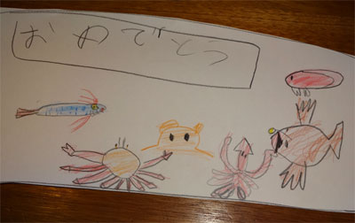 昨日は、実は妻の誕生日。息子(7歳)が、絵を書いて部屋に飾ってくれていました。 でもこの絵、、、、 左から リュウグウノツカイ、タカアシガニ、メンダコ、ダイオウイカ、チョウチンアンコウ、サケビクニン・・・ 全部深海魚。マニアック・・・ それに、別にウチの妻は深海魚好きじゃないのにな・・・ |