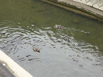 ![]() 鴨と鯉が泳いでいます。 |