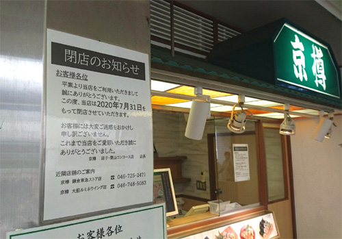 京急の逗子・葉山駅を通りかかったら・・・ 京樽閉店の文字が・・・2020年7月31日をもって閉店させていただきます。と書いてありました。 え? 明日で閉店! 飲食は全国的に厳しいけど、テイクアウト系はプラスでは・・・?と思っていただけに、けっこうショック。 次は何になるのでしょう? 前向きに、楽しみに待つことにしましょう。 |