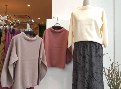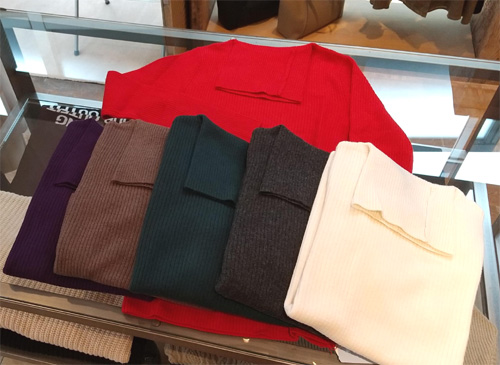 柿をむいていて。いや、正確には、柿をむき終わって、包丁を洗ったときに、包丁の刃元が薬指にチョンと当たっただけ。 なのに、まな板がほんのりピンクに染まるくらいでした。ちょっと痛いし。 普通のブログだったら、ここで、ピンクのまな板か指先の画像アップでしょうが、洋服屋さんですから、洋服の写真を・・・ 写真は、ルメランジュのロゴニット。 このニット、素材がイタリアのゼニアバルファ社という、150年もの歴史がある高級ニットを使用していて、肌触りも抜群!仄かな光沢もあって、洋服好きには堪らない感じです。 お値段、¥15,000+税。 ご興味ある方は、コチラのページをご覧くださいませ。 |