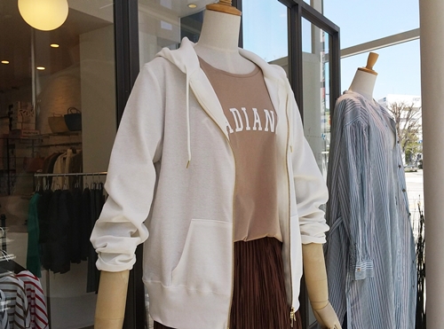 というわけで、写真のような少し爽やかなスタイルを・・・ パーカーはマイカ&ディールのもの。 シャリ感のあるコットン素材で、コンパクトなシルエット、 大人っぽく綺麗に着ていただけます。 梅雨の羽織や真夏の冷房除けにも。 お値段、¥15,400(税込) 詳しくはコチラのページをどうぞ。 中に着ているカットソーは、ミランカのフレンチスリーブのロゴカットソー。 薄手で上品な質感のコットン、サイドスリット&後ろ下がりデザインで色々なボトムにあわせられます。 お値段、¥7,480(税込) 詳しくはコチラのページをどうぞ。 |