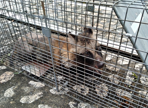 ここのところ、片付けても片づけても、実家の庭に誰かがうんちをモリモリにするので、色々調べると、ため糞(同じ場所に何度も糞をして縄張りを表す)するのは、ハクビシンかたぬきか、、、ということを突き止めた。市役所から箱罠を借りてしかけたら、、、タヌキでした。(前回はアライグマ。2022年12月21日ひとりごと参照) 捕まえてみると、なんともまあかわいらしい。でもキツネのような顔立ち。痩せている。よく見ると、お尻から尻尾にかけて毛が無い。 市役所の方の話によると、カイセンという皮膚病とのこと。 タヌキは日本古来の動物なので、市役所の方が迎えに来て、動物園で保護、その後、山に帰すのだそうです。よかった。 これで、うんちモリモリ事件は一件落着、ですかね・・・ |