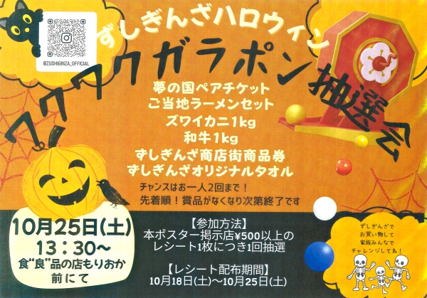 になって、逗子葉山青年会議所主催のハロウィンパレードがあります。それに伴い、逗子銀座商店街では抽選会を実施! 明日、18日(土)〜25日(土)のお買い上げ500円以上のレシート1枚で、1回抽選ができます!(おひとり様2回まで) 景品は、ズワイガニ、和牛、ご当地ラーメン、夢の国(固有名詞を販促に使ってはダメみたい)のペアチケットなど。 抽選場所は、食良品の店もりおか前にて。 25日(土)13時半〜15時(景品がなくなり次第終了) ハロウィンイベントの詳細は、逗 子葉山青年会議所のインスタグラムページをご覧下さいませ。 先週は逗子市民祭り、明日は亀岡八幡宮でピンクリボンフェスティバル、来週は逗子銀座通りでハロウィンパレード&抽選会、 秋のイベント目白 押しですが、是非皆様お出かけ下さい〜〜 |