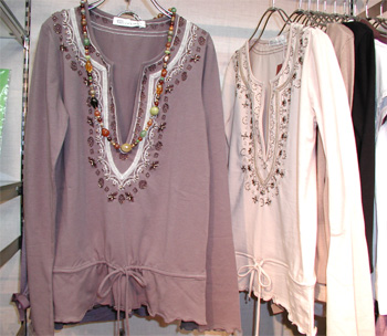 すっかり店頭は秋物。ウールのものや、カシミア混、ファー付きのものなどがどんどん入荷していますが、すぐに着れて、綿素材で、ちょっとオシャレな感じ、、、というのが良いのではないでしょうか? で、右写真。 ●ブラーミン エスニックカットソー ¥13000(税込み¥13650) ちょっと開きが深いので、タンクトップなどを合わせると良いと思います。 ちなみに、あわせてあるアクセサリは、ショーンバズナーというアメリカの女性デザイナーのものですが、彼女は子供の頃からガレージでアクセサリを作っていた、というほどのアクセサリ好き。 大ぶりの天然石の配置も、彼女ならではの感性が光ります。 *Sold out |