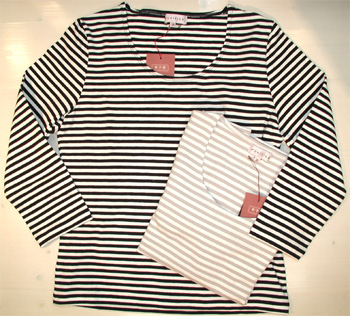 ![]() というわけで、昨日のリクエストにお答えしまして、左写真。 ボーダーのカットソー。 今年はとても人気あります。 レースがついたり、ちょっとひねりのあるものも多いですが、こういうシンプルなものが使いやすくて人気。 白いジャケットのインナーにすると、さわやかで今年っぽさアップ! ●ピュリフィエ ボーダーカットソー *Sold out ¥7000(税込み¥7350) バスト約83センチ、着丈約52センチ。 綿95% ポリウレタン5% |