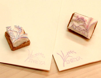 ![]() コレ、消しハン。消しゴムで作ったハンコ。 稲穂のデザインに、INEYAの店名入り。 お客様からいただいた。 それもご夫婦で彫ってくれた!! 右がご主人作、左が奥様作(だったかな?) う〜む。愛を感じます。 |