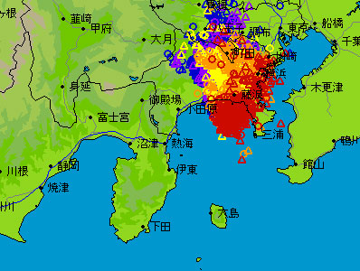 昨夜も今朝も、雷に大雨、怖かったですねぇ、、、特に昨日は、ちょうど帰り道。ビニル傘さしていたので、ものすごく怖かった。 全然人通りはないし、道路は川のようになっているし、これでもかという数の雷の轟音。 「ああ、遭難って、これくらい怖くて孤独なのかな」と思ってしまうほど。 悔しいので、早速東京電力のページで昨日の落雷情報、調べてみた。 そしたら、、、真っ赤赤じゃないですか! 今年の2月にも落雷情報、書いてるけど、 「青色が今朝の6時くらい、紫が6時半くらい、オレンジは6時45分くらい、赤は7時くらい。△は対地雷で、○印は雲間雷なんですって。」ですって。 昨日のは、そんなの判別できないくらじゃないですか! おまけに自宅では脱衣所の天井の換気扇からなぜか雨漏り・・・ お店では2階(倉庫)の天井から案の定雨漏り・・・・ というわけで、関係ないですけどステファンの新入荷バッグ、ショッピングページにアップしましたので、そちらも是非。 |