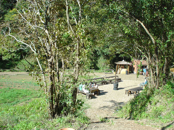 昨日は定休日。とても天気が良かったので、昼間のSYOKU-YABO農園に行ってみました。 自宅から車でなんと20分で行けた。 逗葉新道から南郷トンネルを抜ける三浦半島中央道路を抜け、湘南国際村を通って秋谷に抜けて134号を左折。 葉山の立石、マーロウさんを過ぎて、京急ストアを左折、大楠山登山口方面へ行き、左に折れると到着。 上記ルートで、横横の逗子インターからだったら15分くらいで行けるんじゃないかなぁ、、、 写真は、一段高くなっている席から下の方を見降ろしたところ。 左に畑が広がっていて、中央には炭火で何かを焼くカマドがあり、右の建物が厨房。 |