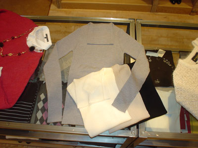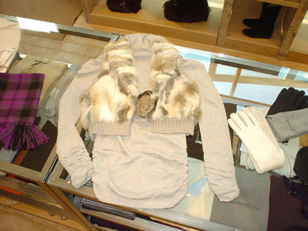 最近の人気商品は右写真、ファーのベスト・・・ではなく、その下にきているカットソーのタートル。 ウエストと袖と肩にシャーリングがあって、裾をすこし出したり、袖をすこし出したりするスタイリングにはピッタリなアイティムです。 あと、忘年会などの時に、お酒が入って、暑いんだけどインナーはプレーンなタートル+毛玉付きで脱ごうにも脱げない、なんていう経験はありませんか? そんな時に、コレを着ておけば、一ひねりあって、「おっ!」と思われること間違いなしです。 気になるお値段は12600円(税込み)。お買いものはコチラ! ついでに写真のファーのベストが気になる方はコチラでお買いものもできますので一緒に是非・・・ |