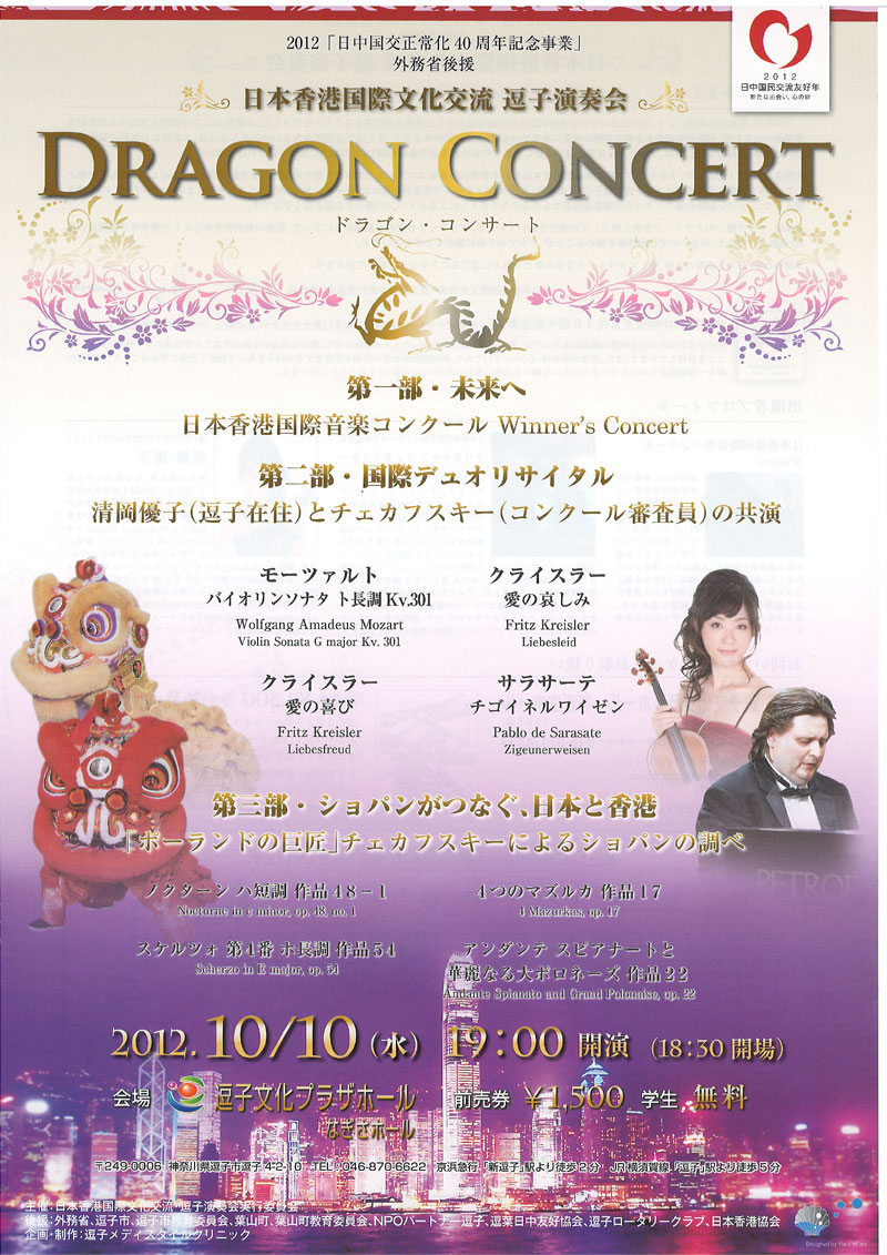 | 今週の水曜日は、128ビル4階の逗子メディスタイルクリニックさん主催のコンサート、 「ドラゴンコンサート」が、逗子文化プラザなぎさホールで開催されます。 今年は日中国交正常化40周年。その記念事業の一つとして、日本香港国際音楽コンクールでの入賞者を逗子に招き、演奏してもらいながら日中の文化交流を図る、というのが趣旨。 その他、逗子在住のバイオリニスト、清岡優子さんの演奏や、様々な国での音楽コンクールの審査員もされている、クリスチャンシェカフスキー氏のピアノ演奏なども聴けるらしいですよ。 ここのところ、尖閣問題で、日中関係は冷え込んでしまっていますが、政治は政治としてキチンと見守りつつも、 我々一人一人が積み重ねた文化交流によって、お互いの理解を深めることができれば、アジアの平和に繋がると思います。 10月10日(水) 18時30分開場・19時開演。 \1500 チケットは、INEYAでも、4階のメディスタイルクリニックさんでも、B1の逗子物語さんでも扱っていますので、気になる方は是非・・・ 詳しくはコチラのチラシをご覧ください。 |