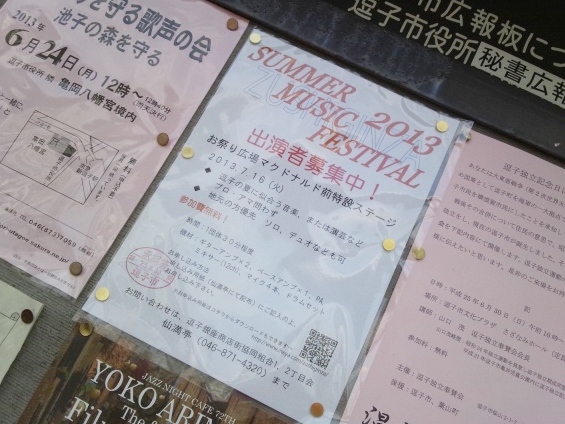 すっかり恒例になった、サマーミュージックフェスティバル(逗子駅ロータリー、マクドナルド前お祭りステージ・7月16日) ですが、只今出演者募集中です。参加費無料。ここ数年、土日祝日に重なっていて、応募者多数、スケジュール組むのが大変だったのですが、今年は平日になってしまい、申し込み激減・・・ いや〜。困った・・・ なので、数年ぶりに、逗子市の広報掲示板にポスター掲示しました。 写真は逗子駅前の掲示板。そのほか、逗子文化プラザ前、逗子市役所前にも掲示してあります。 逗子駅前の、たくさんの人たちの前で、腕試しをしたいバンドマン! また、近くにバンド活動している知り合いをご存じでしたら、是非応募をよろしくお願いします。 申し込み用紙にご記入の上、仙満亭(INEYAの向かい)まで、お申込み下さい。 詳しくはコチラをご覧くださいませ。(申込書のダウンロードもできます) |
