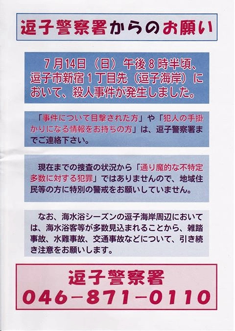 ![]() それはそうと、もう色々なニュースで話題になってしまっていますが、昨夜、逗子海岸で殺人事件があったようです。 ああ。とうとう・・・ 僕の友人は2年ほど前、「夏の逗子海岸は尋常じゃない。夕方から行ってみな。あれじそのうち殺人事件が起きてもおかしくないよ」 と言ってましたが、その通りになってしまいました。 つい先週、平日に行った時には平和だったのですが。 それも現場は僕がフローズン生を買ったすぐ隣の通路。 そんな訳で、夏の週末の夕方〜夜は、逗子は治安が悪いですので、いらっしゃる方は注意して下さい (→こんなこと書かなきゃいけないとは、嘆かわしい・・・・ ) |