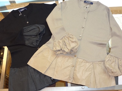 さて。写真は少し変わったデザインのカーディガン。 普通の、クルーネックリブニットのカーディガンの袖と裾に、少しハリがあるタフタ生地が付いています。 シンプルなTシャツやパンツも、コレを一枚羽織るだけで今年っぽく様になりそうな優れ物。 気になるお値段は、¥16800(税込) 詳しくはコチラのページをどうぞ。 |