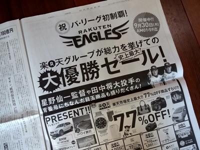 | 弱かった楽天イーグルスも、パ・リーグの優勝間近! マジック3 ですって。 最短で明日、優勝が決まります。 ワクワクしますねぇ・・・・ な〜んて、僕はニセ阪神ファンなので、全くパリーグには興味ナシ。東北楽天ゴールデンイーグルスにも、申し訳ないけど興味ナシ。 でも、優勝したら、楽天市場では史上最大のセールをやる、というから、それには参加せねばなるまい。 ということで、当店のWEBショップもやりますよ〜 楽天優勝セール! 優勝した日の夜中12時から、9月いっぱい、全品ポイント10倍です。 さあ、そんなわけなので、みんなで楽天を応援しましょう!! |