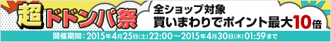 メルマガを読まれている方には、そろそろお知らせが配信されると思いますが、今晩10時~ 楽天市場のイベント、「超ドドンパ祭」が開催されます!お買いものマラソンと同じく、楽天内の複数店舗で買い回ると、その分ポイントが倍、倍に・・・ 当店はその期間、全商品ポイント5倍です。 気になっていたサンダル、迷っていたヘレンカミンスキー等、ゴールデンウィーク前のお買いものは、この機会に是非・・・ エントリーを忘れるともったいないので、買っても買わなくても、とりあえずエントリーをどうぞ。 |
