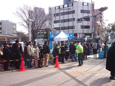 今朝、お店に来ると駅前広場で何やらイベントの準備をしている模様。にしては、テントが少ないし、ちょっと寂しげだな、、、、と思っていたら、 10時過ぎにどんどん人が増え、、、みずほ銀行前まで長蛇の列。 スゴイ集客力だ!! |