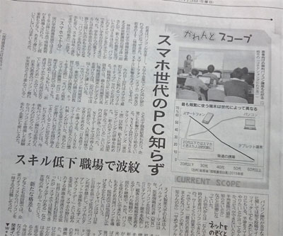 写真は昨日の日経新聞。最近、大学生のPCのスキルが落ちているんだとか。タイピングが遅かったり、片手で入力していたり、メールに件名も差出人も書かなかったり。 まあ今はPCじゃないと出来ない作業がけっこうあるからそう言われるんでしょうけど、ほとんどの会社はプログラミング等は必要とせず、ソフトを使いこなせれば良いのだから将来的には大丈夫だと思う。 スマホもタブレットも、たぶんもっと使い易くなるだろうから。いや、もっと違ったデバイスが主流になるかも。 ボクが学生だったとき、情報処理基礎というパソコンの授業があって、COBOLかFORTRANかプログラミング言語を選ばされて、自分用の5インチのフロッピー(3.5インチじゃないですよ。直径13センチくらいのやつ)2枚を用意するよう指示されてたけど、今、そんなの使っている人見ないですもんね。ウインドウズもまだ無かったし。 「昔はね。メールを両手でタイピングしてたんだよ」 なんていう時代がすぐソコかもしれない・・・ |