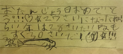 そして、お手紙まで。・・・・ちょ、、、27歳って・・・ そういえば、小さい頃から、「お母さんは26歳だよ」と教えていたのを思い出した。 ここまでサバ読んでおけば、潔いと思いまして、、、 でも、らいねんは28さいだね もうすぐ30さいだ!ですって。そりゃもう算数を習っているからね。 困った。いつ本当の事を伝えようか・・・ |