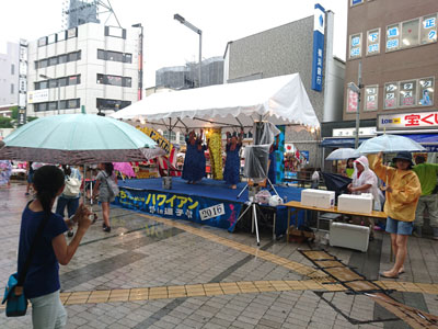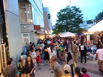 お祭り2日目。昨日とはうってかわって、晴れ。というか、曇り予報だったので、日差し対策、全くしてこなかった。参った・・・ 写真は、18時半頃の、お店の前。ロータリー側。 土曜日だけあって、ずいぶんな人出です。 |