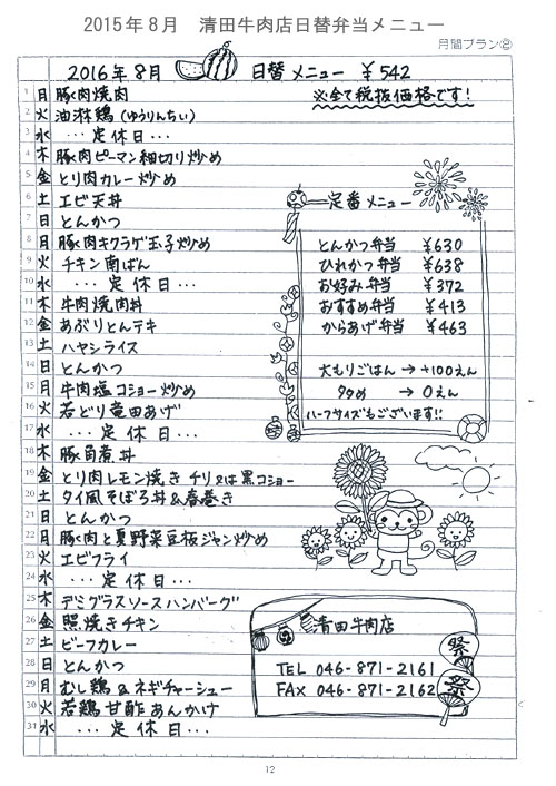 毎日毎日、セミを捕まえては親に報告しては逃がしている息子(小2@夏休み中)ですが、昨日は捕まえて母親に見せようとして失敗、家のリビングに放してしまい、ブンブン飛び回り・・・・ 叱られていました。 でも止めないんだろうな。アブラゼミ、ミンミンゼミなんて、わざわざ報告せんでええ! もっと珍しいのを捕まえてこい! と言いたいのをこらえ、「ヒグラシか、クマゼミを探してきてよ」と頼んでおいた。 捕まえられるかな・・・? そして、8月になりましたので、おなじみ、8月の清田牛肉店日替り弁当メニューを。オススメは、明日の油琳鶏、ですかね。 そして、3日、4日は、お店はプチ夏休みを頂戴します! スタッフNさんは、なんと!この暑いのにディズニーランドに行くんですって・・・ 気合入っとる。 そして、我々は、キャンプの予定。 昨年、ずいぶん道具を買い足してしまったので(2015年8月3日のひとりごと参照)、行かないともったいない・・・ 幸い息子もキャンプ大好きになったみたいですし。 そんなわけで、このコーナーも少しお休みして、8月5日にまたお会いしましょう! |