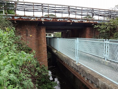 ![]() 横須賀線の鉄道橋。 ココから先、川沿いには進めなくなりました。 ちょっと遠回りして、向こう側へ・・・ 名前のない橋ですが、このレンガ造りがなんとも情緒ある橋。 |