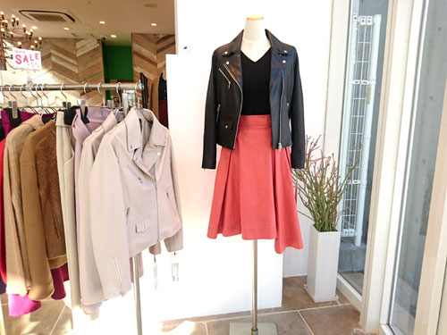 そして! 今日の写真は、昨日職場体験に来てくれた、中2のMさんのコーディネート。レザーのライダースジャケットに、アシンメトリーのスカートを合わせているスタイリング。インナーのシンプルな黒ニットが、ジャケットとスカートを引き立たせていて、とても良いと思います! 気になるお値段は・・・ リイナのアシンメトリースカート、¥16,000→¥11,200(+税) ミミ&ロジャーのシンプルなVニット¥16,000→¥11,200(+税) ディニテコリエのレザーライダースジャケット¥37,000→¥25,900(+税) ジャケットだけアップしてありますので、気になる方はコチラのページをどうぞ。 |