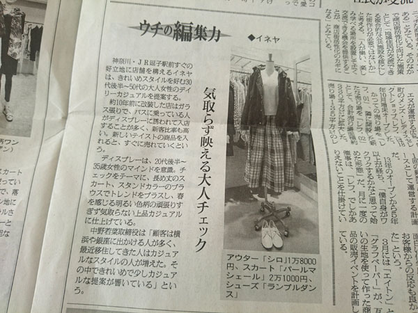 今朝の繊研新聞(業界紙)に掲載いただきました! 「春を感じる明るい色柄の、頑張りすぎず気取らない上品カジュアル」とボディのスタイリングをコメントしていただいていますが、その通り。記者の方はさすがプロ、取材にいらしていただいたときに、ツラツラととめどもない話をしたら、ちゃんとわかりやすい記事にしてくれていました・・・ しかし、お店の名前、「イネヤ」って書いてあるけど、大昔は「稲屋」そして「いねや」に変わり、次は「亥子屋」そして今は「INEYA」まあ読みは同じだからいいですけど。 ちなみに、掲載されたスタイリングで、WEBで購入できるのは、、、、ランブルダンスのシューズです。 詳しくはコチラのページをどうぞ。 追加で入荷しまして、サイズもありますので、ご興味ある方は今のうちに是非・・・ |