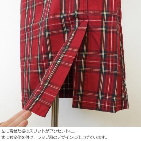 ボタンとファスナー、裾のスリットを左に寄せたラップ風のデザインがポイント。
