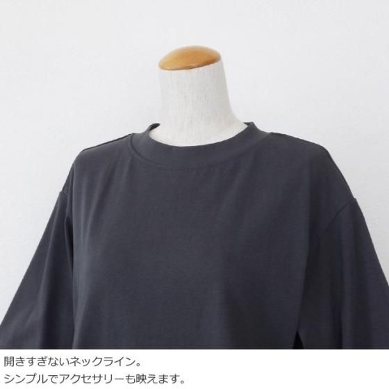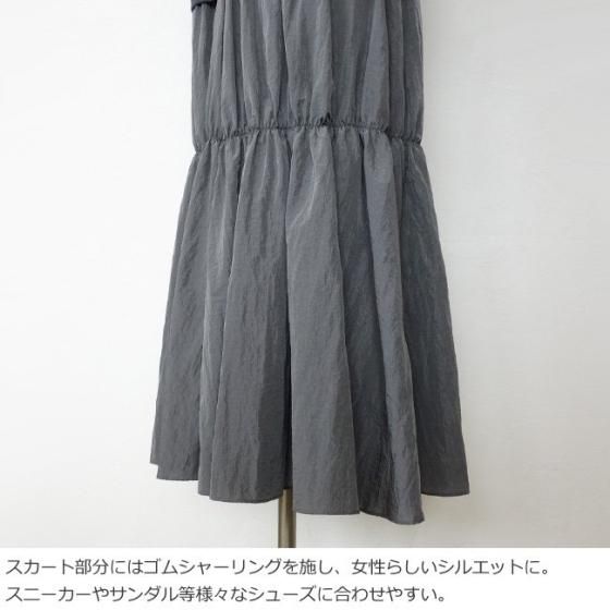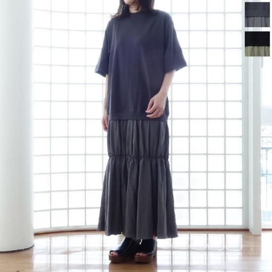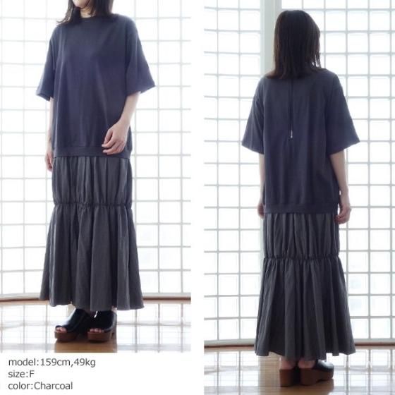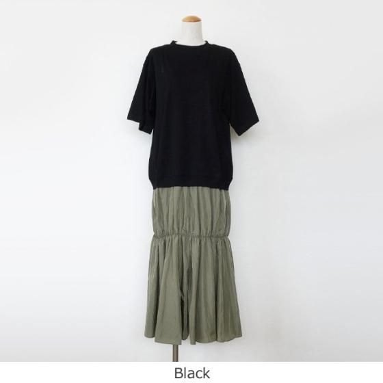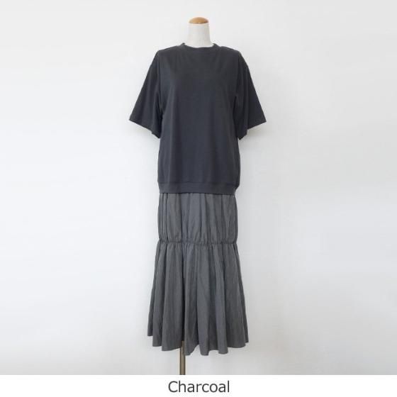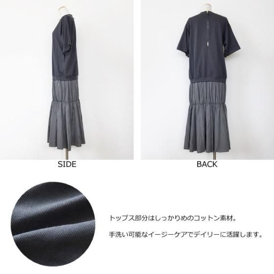 ゆったりとしたトップスとシャーリングスカートを合わせたドッキングワンピース。