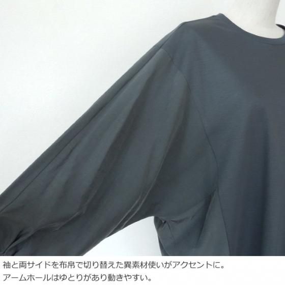 袖と両サイドを仄かな光沢のある布帛で切り替えた異素材使いがポイントです。