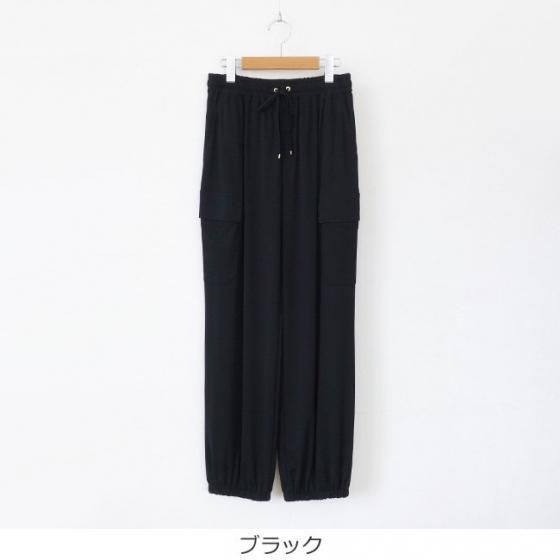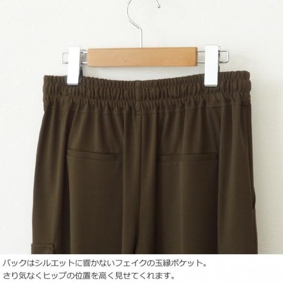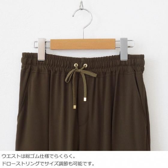 さらりとした肌触りで落ち感のあるポリエステル素材を使用したパンツ。