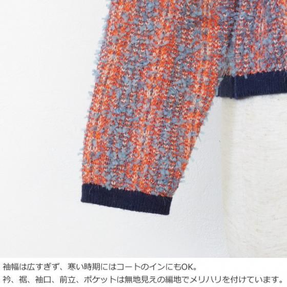 衿、裾、袖口、前立、ポケットは無地の編地でメリハリを付けています。