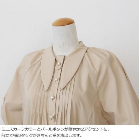 程よいフレアラインと衿元を華やかに彩るミニスカーフカラーが特徴です。