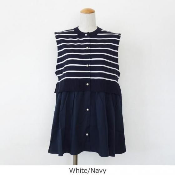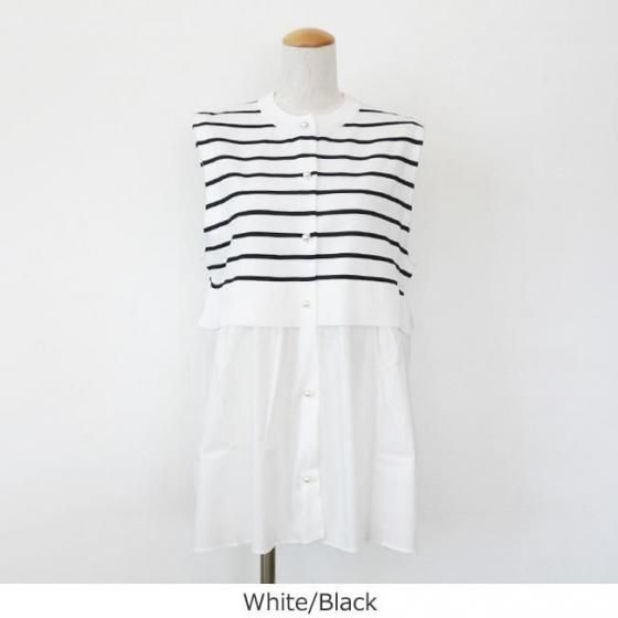 ニットとシャツを重ね着したような異素材ドッキングのカーディガン。
