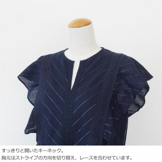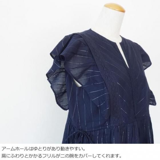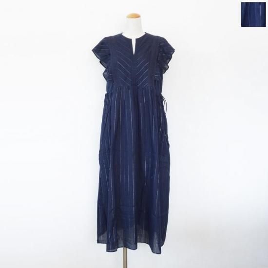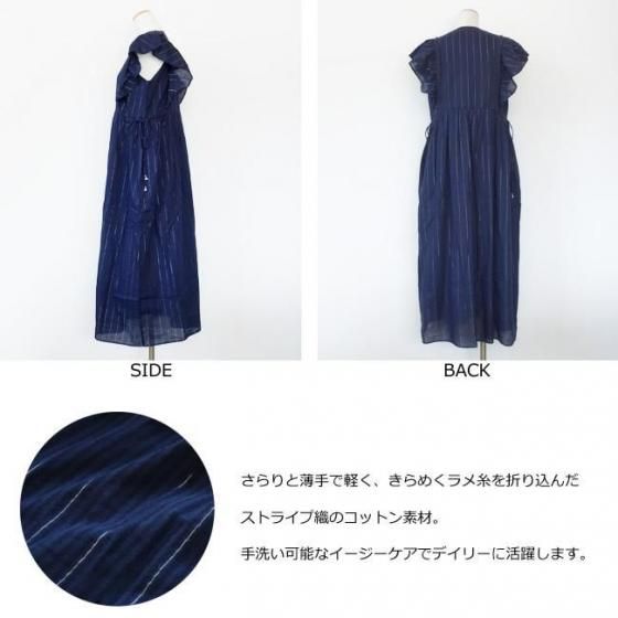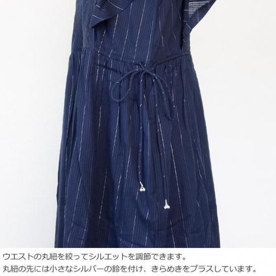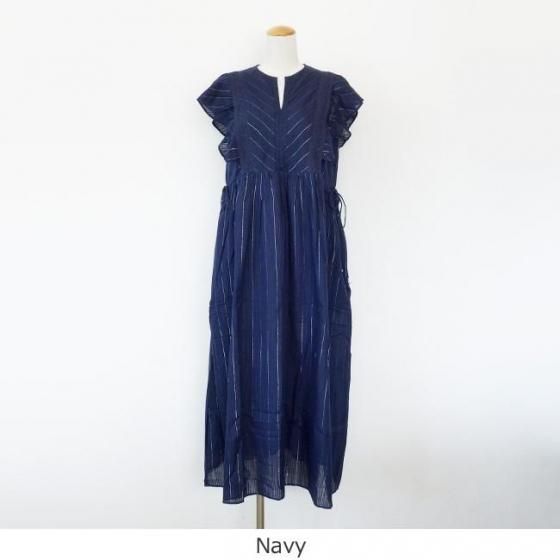 ラメ糸を織り込んだストライプ織のコットン素材を使用したワンピース。