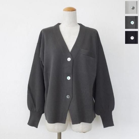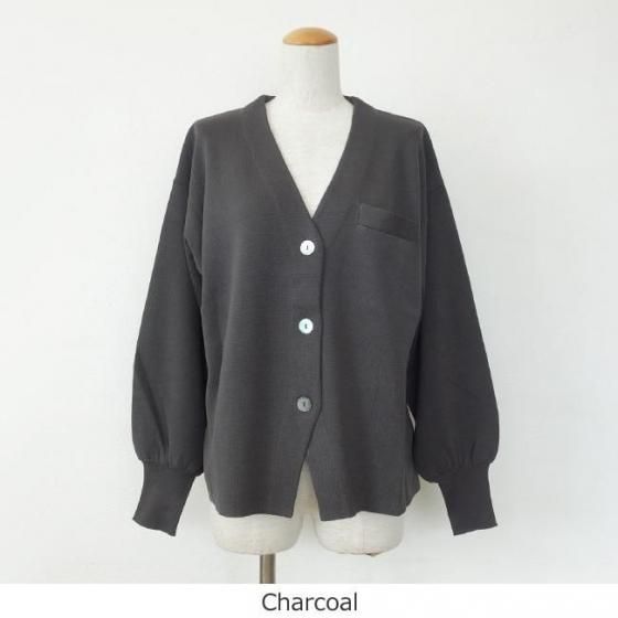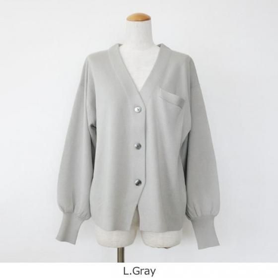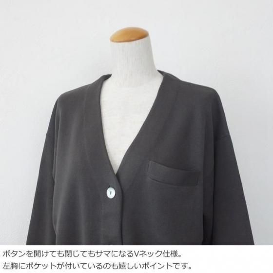 前を開けて羽織っても閉じてもサマになるノーカラーのVネック仕様。